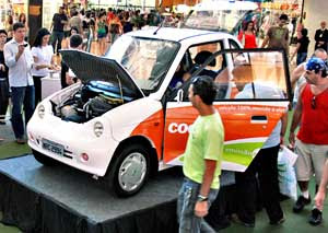 O carro fabricado pela marca indiana Reva, já faz parte da frota da empresa, foi experimentado pelos clientes do shopping num test-drive.