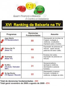 A campanha “Quem Financia a Baixaria é Contra a Cidadania”, desde sua criação em 2002, prima pela qualidade da programação televisiva e, ao denunciar os programas que desrespeitam os direitos humanos, pretende colaborar com a sua melhoria já que a televisão constitui um importante instrumento na formação da cidadania. Participe, vote, dê a sua opinião. Sua participação faz toda a diferença! Para mais informações e contribuir com a enquete acesse: http://www.eticanatv.org.br/index.php?sec=1&cat=1&pg=28