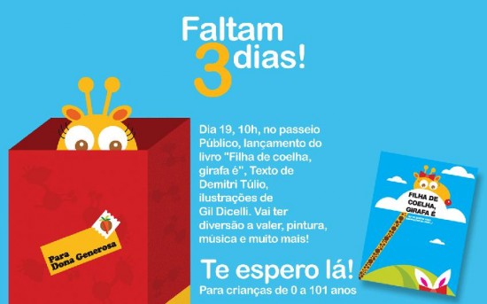 O jornalista e escritor Demitri Túlio, lança neste sábado, 19, às 10h no Passeio Público, seu livro infantil Filho de Coelha, Girafa É. O livro é ilustrado por Gil Dicelli.