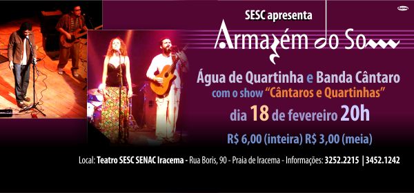 Nesta sexta, 18, às 20h, no SESC Iracema, no projeto “Um mais um mais que dois”, as bandas Água de Quartinha e Cântaro se encontram para um show que misturará o repertório dos dois grupos. Esse show será gravado por e será produzido um CD desse material, posteriormente lançado pelo Selo Radiadora Cultural.