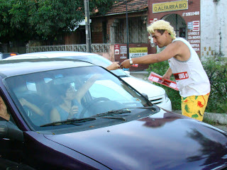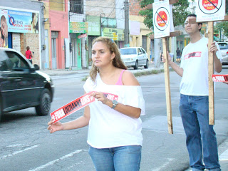 Portando faixas, placas, cartazes e adesivos, em meio ao burburinho do trânsito da avenida 13 de Maio, motoristas e pedestres eram abordados recebendo material do manifesto.