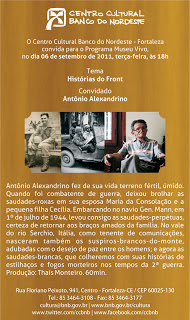 HISTÓRIAS DO FRONT 06/09/2011 by Joanice Sampaio Facebook Twitter Google+ Pinterest Gmail Blogger Tumblr Antônio Alexandrino é ex-combatente da II Guerra Mundial. E é sobre essa experiência que ele conta nesta terça-feira, 06, às 18h, no projeto Museu Vivo do Centro Cultural Banco do Nordeste-Fortaleza. Grátis.