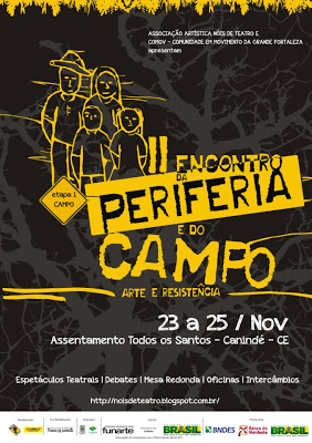 O evento, que acontecerá no Assentamento de Todos os Santos, comunidade localizada a 32 km da sede do município de Canindé, no sentido de Santa Quitéria, promoverá o encontro da produção artistica e intelectual de nove grupos de teatro da periferia de Fortaleza com outros nove grupos de assentamentos de reforma agrária do Ceará. Nesse espaço de trocas, pensamentos e articulações, os grupos participarão de oficinas de Teatro do Oprimido, Teatro Político e Teatro Épico, Percussão, Danças e Brincadeiras Populares, além de participar, na tarde do sábado, dia 24, da Mesa Redonda “Os desafios de um Teatro que vem das margens: política e resistência”, que terá como expositores a atriz do Nóis de Teatro Erika Peixoto, os assentados Emanuel Rodrigues e Inácio Nascimento, além da presença de Herê Aquino, integrante do Movimento Todo Teatro é Político e do ator Gyl Giffony, pesquisador em Organização da Cultura e Direitos Culturais. Os 18 grupos participantes poderão discutir o fortalecimento do teatro realizado na periferia de Fortaleza, os impactos das novas políticas culturais do estado e do município na produção local, além de fortalecer a ação cultural dos assentamentos rurais, articuladas em parceria com o Projeto Arte e Cultura na Reforma Agrária, do INCRA-CE.