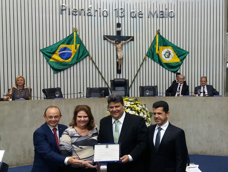 Evento que fomenta a economia e o turismo do Ceará e põe a capital como vitrine de um dos maiores festivais de música do país, o Fortal foi homenageado pela Assembleia Legislativa do Estado do Ceará nesta quarta-feira, 12. Convocada pela deputada Fernanda Pessoa, a sessão solene teve como representante do Fortal um dos diretores do evento, Colombo Cialdini, que recebeu uma placa honrosa e discursou na tribuna. Também marcaram presença as filhas e a mulher de Colombo Cialdini; o deputado estadual e primeiro secretário da Assembleia Legislativa, Sérgio Aguiar; e o secretário de turismo de Fortaleza, Erick Vasconcelos. (Foto: Divulgação)