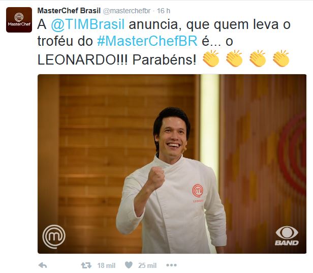 A TIM e a BAND decidiram inovar novamente no anúncio do grande vencedor da terceira edição do Masterchef Brasil. Para prestar uma homenagem aos milhares de fãs do reality show que acompanham a disputa com comentários no Twitter, o nome do ganhador foi postado em primeira mão pela operadora no perfil @Masterchefbr e replicado imediatamente na TV, no programa que foi ao ar ao vivo na noite desta terça-feira 23. Como esperado, o assunto foi um dos mais comentados do microblog nesta terça-feira e bateu mais de um milhão de menções. (Foto: Divulgação)