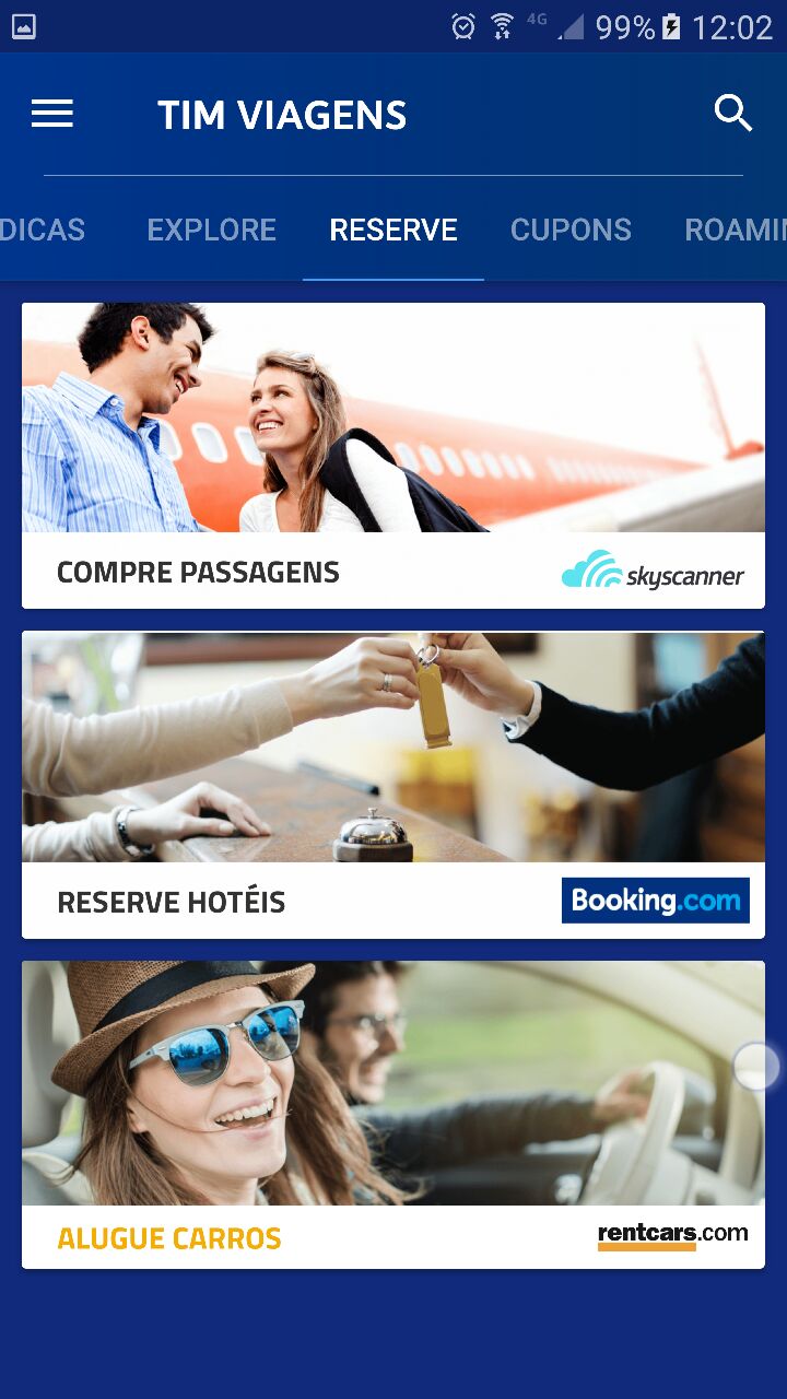 O TIM Viagens manterá o formato de divisão por seções. Na parte RESERVE, o cliente pode buscar e reservar hotéis de seu interesse, por meio do Booking.com, além de encontrar passagens via Skyscanner e alugar carro no Rentcars.com, site que reúne as principais locadoras do mundo. No espaço EXPLORE, estão os melhores roteiros no Brasil e no mundo com dicas de passeios, gastronomia, curiosidades e outras informações úteis ao viajante com conteúdo do Yelp. Já aba CUPONS, o cliente encontra alguns cupons de desconto para compra de mochilas, protetor de bagagens, passagens de ônibus, entre diversos outros benefícios exclusivos.