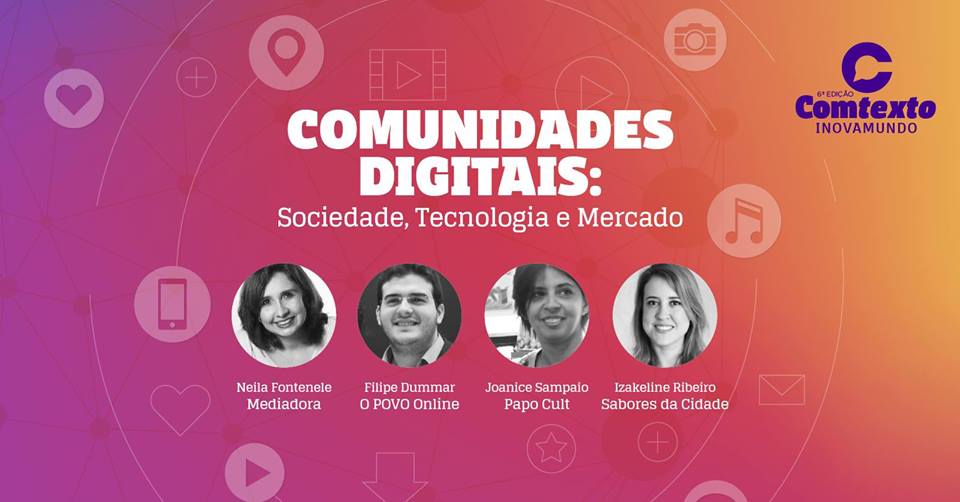 A sexta edição do ComTexto Inova Mundo, acontece nesta quinta-feira, 25, às 18h30, no Auditório da Livraria Cultura. O encontro tem como tema Comunidades Digitais: Sociedade, Tecnologia e Mercado e terá como convidados os jornalistas Felipe Dummar (O POVO Online), Joanice Sampaio (Papo Cult), Izakeline Ribeiro (Sabores da Cidade) e mediação da jornalista Neila Fontenele ( O POVO). As inscrições são gratuitas e podem ser realizadas pelo link https://goo.gl/H4Ys2k
