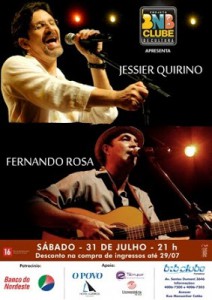Jessier Quirino e Fernado Rosa são as atrações do projeto BNB Clube de Cultura deste sábado, 31. Ingressos: R$ 40 inteira e R$ 20 meia. Informações: 4006 7200.