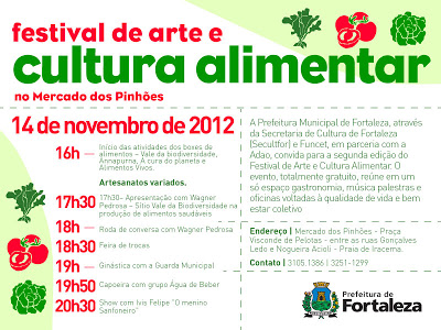 A segunda edição do Festival de Arte e Cultura Alimentar traz, nesta quarta-feira, 14, a partir das 16h, oficinas, palestras, feira de trocas, tudo a serviço de uma vida saudável e sustentável. A programação, totalmente gratuita, é promovida pela Prefeitura, por meio da Secretaria de Cultura de Fortaleza (Secultfor), em parceria com a Fundação de Cultura, Esporte e Turismo (Funcet) e a Associação para o Desenvolvimento da Agropecuária Orgânica (Adao), como desdobramento da Feira de Produtos Orgânicos que já acontece no Mercado dos Pinhões todas as terças-feiras pela manhã.