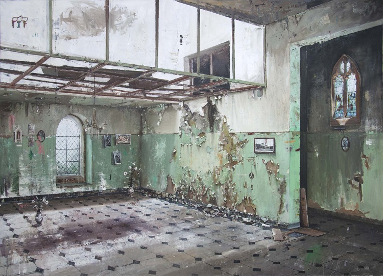 Na exposição “Objetos sobre arquitetura gasta”, o artista apresentará quatro pinturas, produzidas em 2016 e 2017, que representam espaços desocupados. O que interessa ao artista são os vestígios ali deixados. “O processo é iniciado com a procura de edificações desabitadas para o registro fotográfico (e posterior reprodução em pintura) dos locais onde sejam percebidos sinais das ocupações passadas, evidentes na arquitetura e ou nos objetos remanescentes”, explica o artista, que busca o silêncio em suas obras.