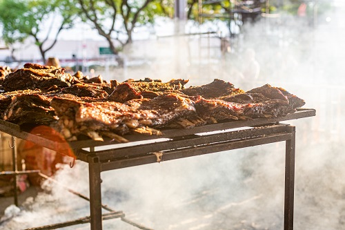 Este é um verdadeiro churrasco raiz a céu aberto com dez estações principais: costela fogo de chão, cupim no varal, chorizo, burger, brisket, costelinha suína e salmão, acompanhados por arroz carreteiro, pão de alho e legumes.