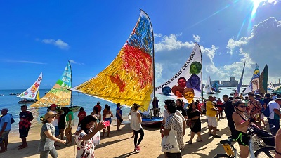 O maior desfile de jangadas com velas pintadas está prestes a zarpar. Este ano, 14 artistas plásticos cearenses foram convidados para a pintura das novas velas da exposição. O evento é promovido pelo Sistema Fecomércio, por meio do Sesc Ceará, e integra a programação do Povos do Mar, que acontece de 21 a 25 de junho. A exposição das jangadas acontece neste domingo, 23, a partir das 8h, com as embarcações saindo da Enseada do Mucuripe, próximo ao Mercado dos Peixes, em direção à Barra do Ceará. Foto: Divulgação.